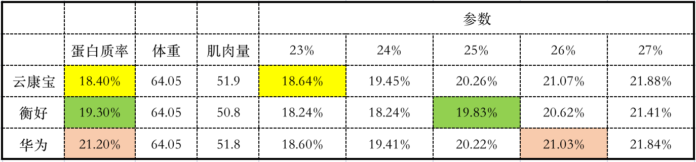 所以,可以推测云康宝选取了23%、衡好选取25%、华为选取26%来计算对应的蛋白质率。因此,体脂秤的数据,不但跟专业仪器对比是毫无意义的,跟不同品牌的体脂秤横向对比也是毫无意义的,因为大家选取的计算参数根本就不一样。