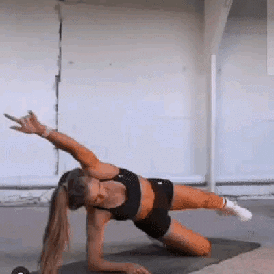 侧撑,下侧手臂屈肘位于肩部正下方支撑身体,上臂举过头顶,小腿弯曲至地面,上腿向前伸展,双脚在地面上保持稳定,腹部发力带动上侧腿向前提膝抬起,同时上侧手臂屈肘向下,使手肘与膝盖尽量靠近
