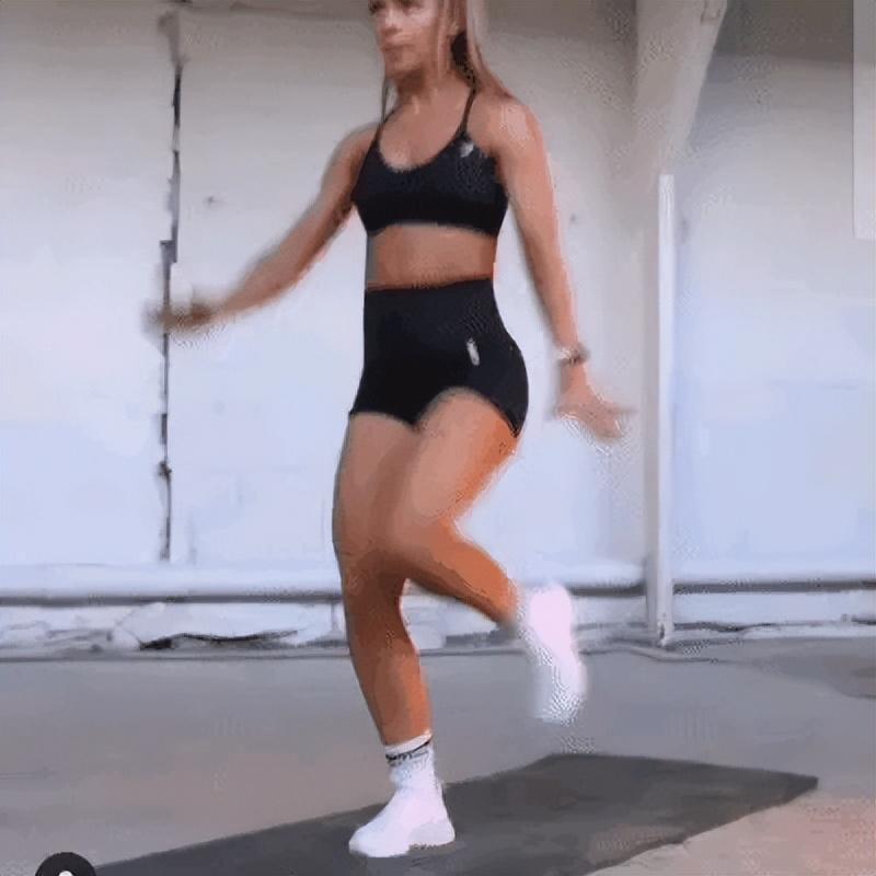 双脚并拢站直,双臂于身体两侧张开,使上半身稍稍向前压低,保持收紧腹部,然后使左脚向左侧跳一步,同时右脚向左后方摆放,脚落地时左腿屈膝,左手扶在左腿上,右腿伸直,右手向后摆,然后再换边进行。如此反复进行30次即可。