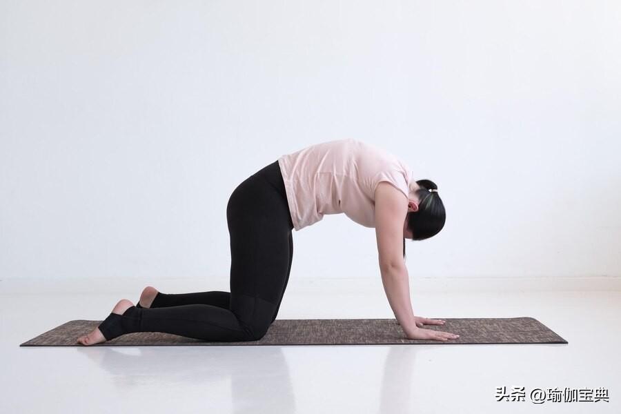 四肢垂直跪在垫子上。吸气,抬头看向天花板,腹部向下。让背部略微弯曲,让胃充满空气。