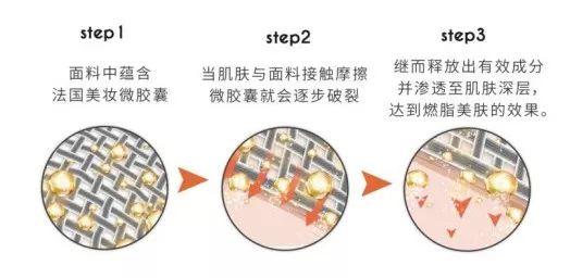 当肌肤与面料接触摩擦,微胶囊就会逐步破裂,胶囊中强的瓜拉纳提取物,它能渗透至肌肤深层,能够促进脂肪迅速燃烧。