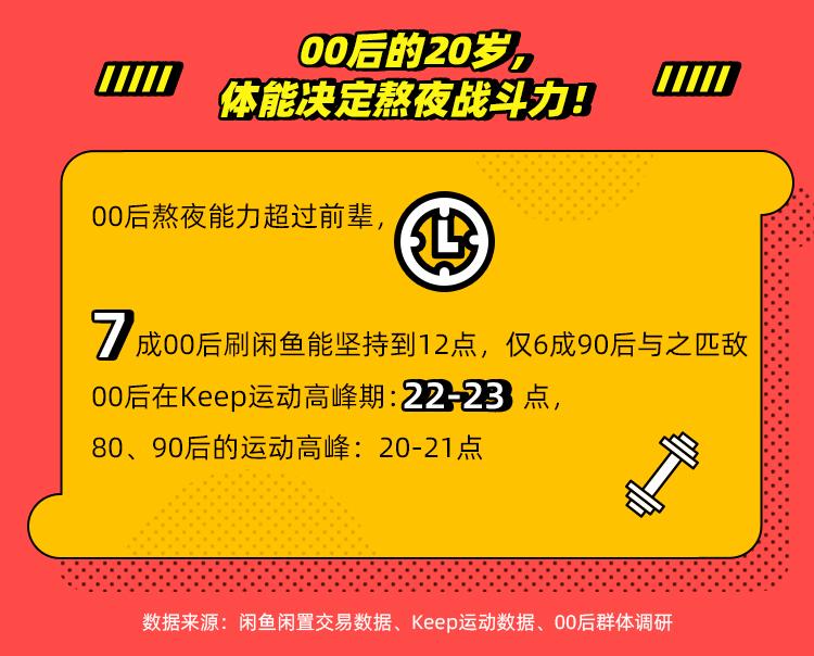 另外,体力优势也决定了00后熬夜能力超过前辈, 7成00后刷闲鱼能坚持到12点,仅6成90后与之匹敌,同时,00后在Keep运动高峰期:22-23点,而80、90后的运动高峰是20-21点。