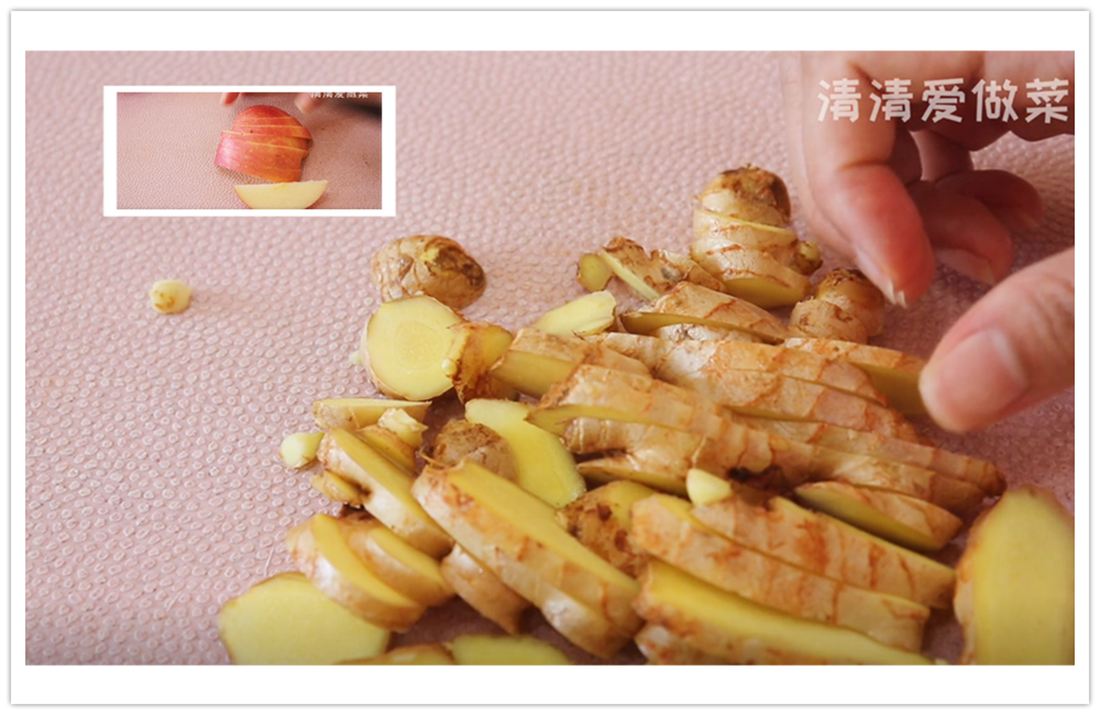 擦拭好生姜给他放到案板上,把生姜给他切成生姜片,切好的生姜我们拿出一小块给大家看一下,切成这样薄薄的生姜片即可。切好生姜我们多留两块给它切成生姜丁,等会儿肯定会用得上。切好生姜直接放到一旁备用。继续拿出擦拭好的苹果,给他对半切开,把苹果给他切成片,看着这个苹果,想起近的苹果13都已经出来了,但是清清买不起,那就尝尝自己亲手的苹果就好。切好的苹果我们同时也流出两块给他切成丁,所有的食材准备好。