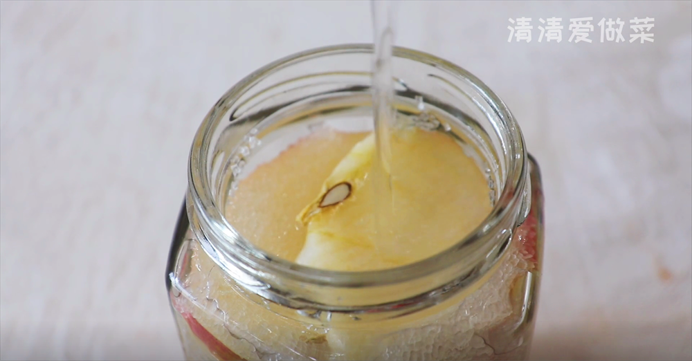我们拿出一个干燥的空瓶子。在瓶子中放入切好的生姜,还有切好的苹果片,铺垫好一份,加入一勺白糖,白糖一定要覆盖完,覆盖好。我们加入半瓶子的白醋,盖上盖子给他酿制一个星期,这样我们简单又实用的苹果醋就做好了。清清这里使用的是白糖,你们也可以使用黄糖哦。后我们拿出一口杯子,在杯子中加入生姜末以及切好的苹果丁,也在杯中撒入一勺白糖,加入40度的温开水,一小把补气又补血的小黑米,下入勺子给他搅拌,搅拌一会儿就可以开喝了。那我们这一个轻松回到100斤的苹果生姜汤就做好了,这样喝上一个月,不到100斤你就来找青青。