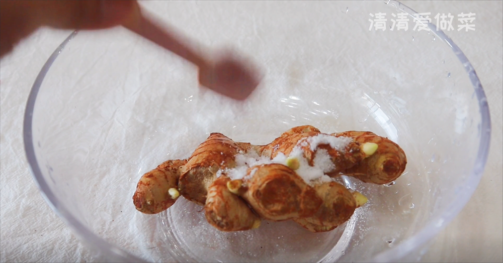接着我们把生姜给他放到碗中,在碗中的生姜焙面上给他撒入适量的食盐,撒完食盐我们给他加入适量的清水,清水不用太多。多一半就好下手,把生姜给他搓洗干净,食用盐呢,它有颗粒感,摩擦生姜起来会果的大,而且也的干净。清洗好的生姜再次使用纸巾给它擦干水分,让它保持干爽的状态。