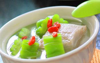 材料和器具:苦瓜150克,猪瘦肉90克,香油、精盐各适量。