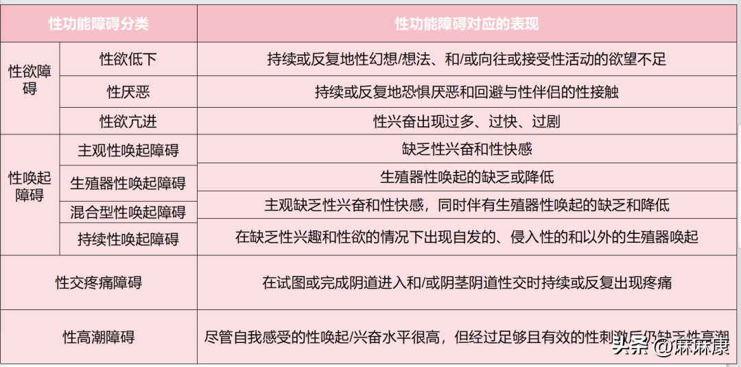 女性x功能障碍(FSD)是指发生在女性x反应周期中一个或几个环节的障碍(x欲减退障碍,x唤起障碍,x高潮障碍以及x交疼痛障碍),具体表现如下: