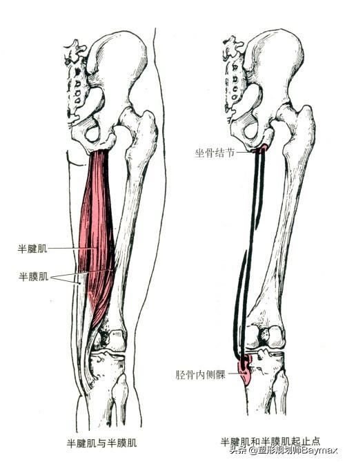 半腱肌和半膜肌位于我们大腿后内侧,半膜肌在半腱肌的深层,半腱肌下半为腱,半膜肌上半为腱膜。两者都起自我们的坐骨结节处,半腱肌止于胫骨上端内侧,半膜肌止于胫骨内侧髁后面。他们主要的功能就是使膝关节屈和内旋。
