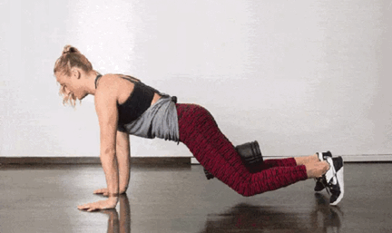 锻炼腰腹核心肌肉力量的动作,用跪姿夹泡沫轴的俯卧撑方式消耗热量,通过俯卧撑运动锻炼腰臀,增强下半身力量。