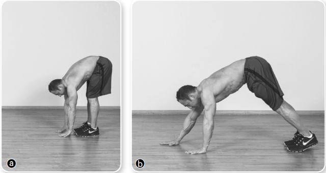 1.从直立站姿开始(a)。双手放在地板上,双脚向后跳,进入俯卧平板撑姿势(b)。