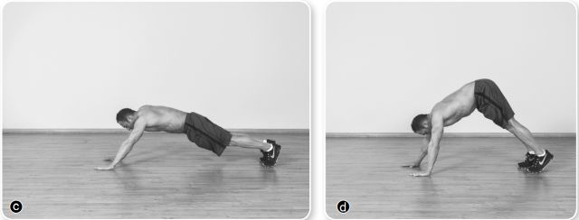 3.一旦达到极限,开始向双手的方向挪动双脚,保持双腿伸直,向天花板方向抬高臀部(d)。