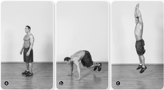 4.跳起来(每次重复至少要尝试跳15厘米高)(c),然后膝盖放松着地。站起进入完全的站立姿势,然后重复建议的次数。