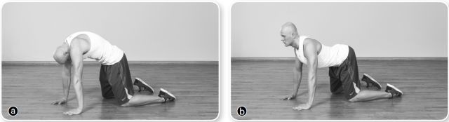 2.将双手紧按在地上,向天花板方向抬高背部中段,下巴贴向胸部(a)。