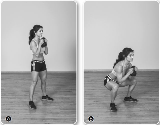 3.在保持控制的情况下尽可能向下蹲,同时保持躯干挺直(b)。一旦完成深蹲幅度,以反向动作回到起始位置。重复进行该动作。