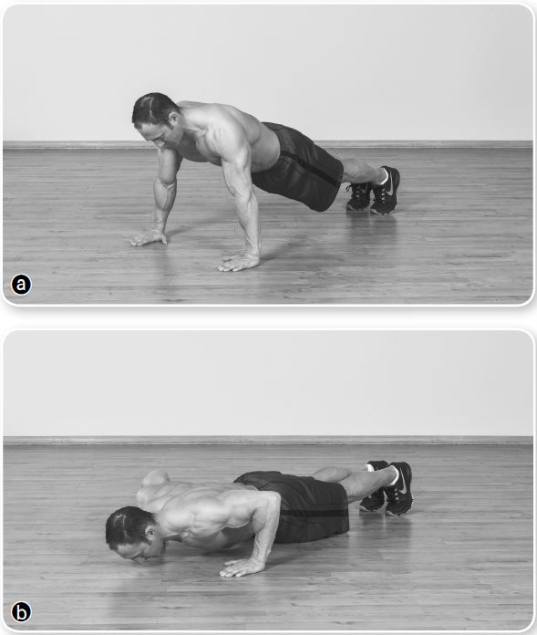 2.保持双肘向肋骨方向收缩,保持自然的脊柱的自然姿势,慢慢降低身体,直到胸部接触地面(b)。