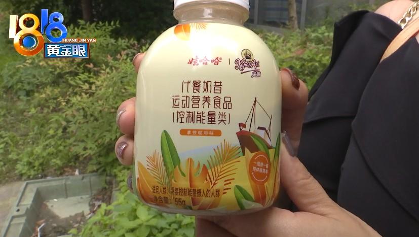 罗女士说的,就是这种娃哈哈火船代餐奶昔,注明是运动营养食品,后面还有个括号注明控制能量类,是拿铁咖啡味。配料包括全脂乳粉、大豆分离蛋白等。罗女士介绍,定价是25元一瓶。