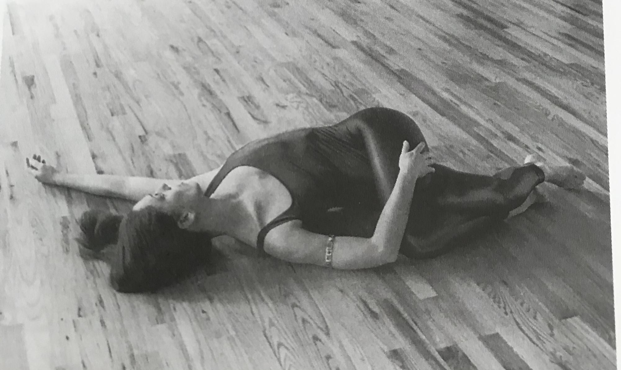仰卧在垫子上,双手体侧平举。屈双膝,左腿在上,大腿交叉,小腿缠绕。呼气时,双腿倒向右侧,眼睛看左手的方向。保持一分钟左右,回正反侧练习。动作9、五角星式