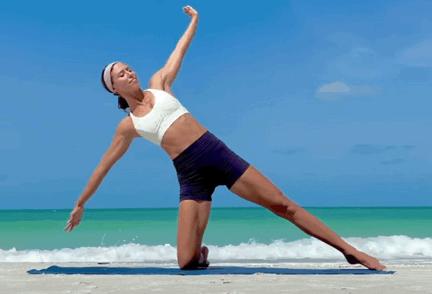 上个体式进入,上半身向左侧屈吸气,右手在右脚内侧撑地呼气,胸腔肚脐转向正前方左手向上伸直,停留5-8个呼吸动作3-4、