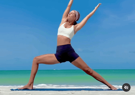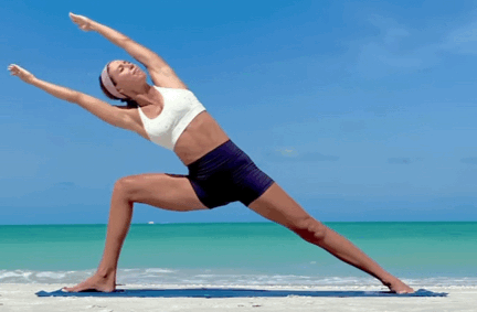 双脚分开大于一腿长,进入战士二式吸气,右髋外旋,右腿屈膝垂直脚跟呼气,收紧核心,右手伸直向上延展身体向左侧屈,停留5-8个呼吸