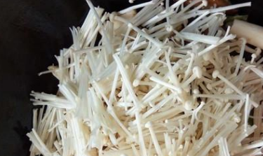 13.加入针菇翻炒匀,倒入碗汁翻炒匀,关火淋入香油调匀既可。