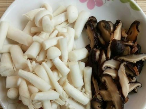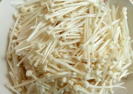 4.针菇切掉根部,也切段。(用开水烫一下)