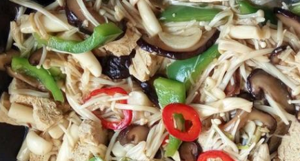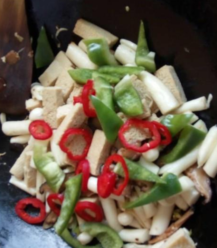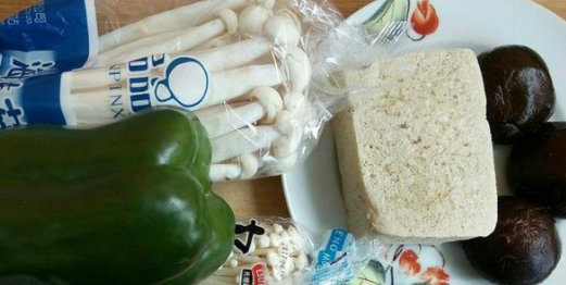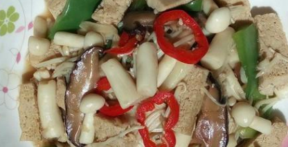 香菇(干) 3朵、海鲜菇 1/2包、金针菇 1包、冻豆腐 200克、蚝油 适量、柿子椒 1/5个、胡椒粉 0.8克、鸡粉 1克、精盐 适量、玉米淀粉 少许、香油 少许、尖椒(红) 1/5个、蒜 2瓣、姜 12克、葱 15克、调和油 10毫升、八角 2瓣、生抽 10毫升、醋 几滴