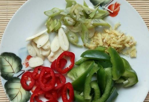 2.青椒炒块,红辣椒切成圈,蒜切成片,葱姜切粒。