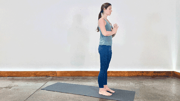 首先在山式中深呼吸并放松几次呼吸。专注于你的呼吸,体重均匀地分布在两脚掌,让所有的关节都对齐