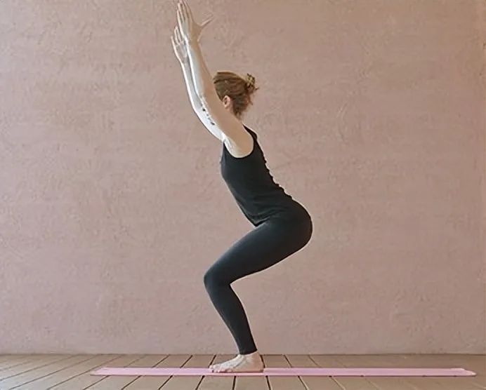 3. 幻椅式站直:双腿分开与髋同宽,肩膀放松,骨盆前倾,双腿启动。吸气,弯曲膝盖,同时将手臂伸直。骨盆保持前倾,背部不会倾斜成凹陷。肩膀保持放松,手臂尽可能靠近耳朵。如果不会导致肩部区域紧张,您可以将手掌并拢。