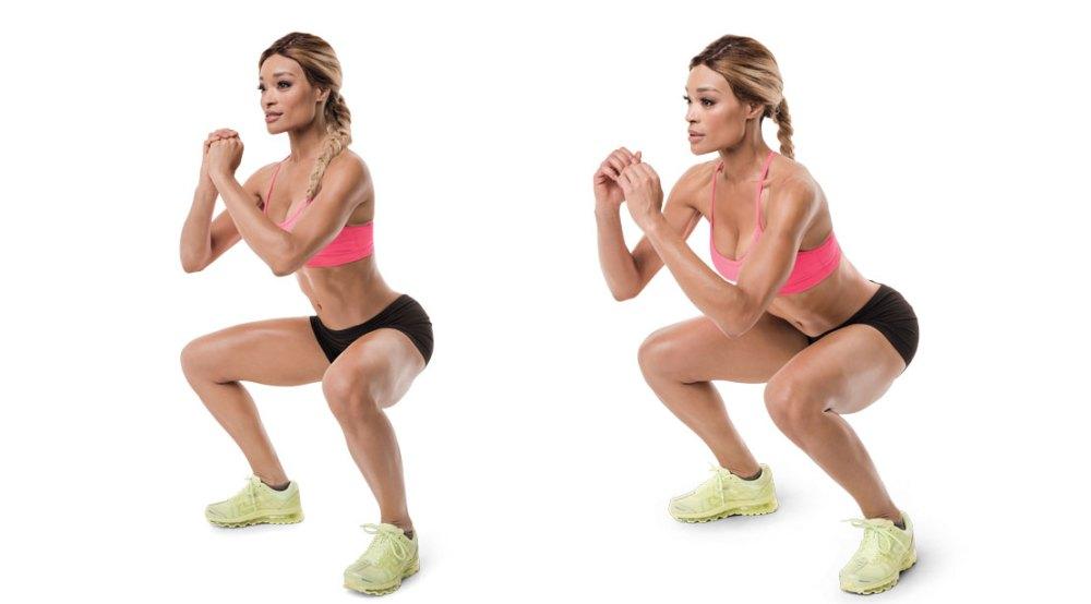 在做相扑式深蹲时,你的双腿要向两侧比髋部的距离打开得更宽一些,双脚稍稍向外外旋,让你的膝盖在下蹲时可以对准脚尖。然后屈膝屈髋将身体向下下蹲,将骨盆保持在肩部的正下方,双脚站稳地面不发生位移的同时,将双腿做外旋的动作,激活臀部肌群。然后从脚后跟开始发力,将身体站立起来,回到起始的站立姿势。你如果想要增加这个动作的训练强度,可以在起身站立的时候,将脚后跟抬离地面。