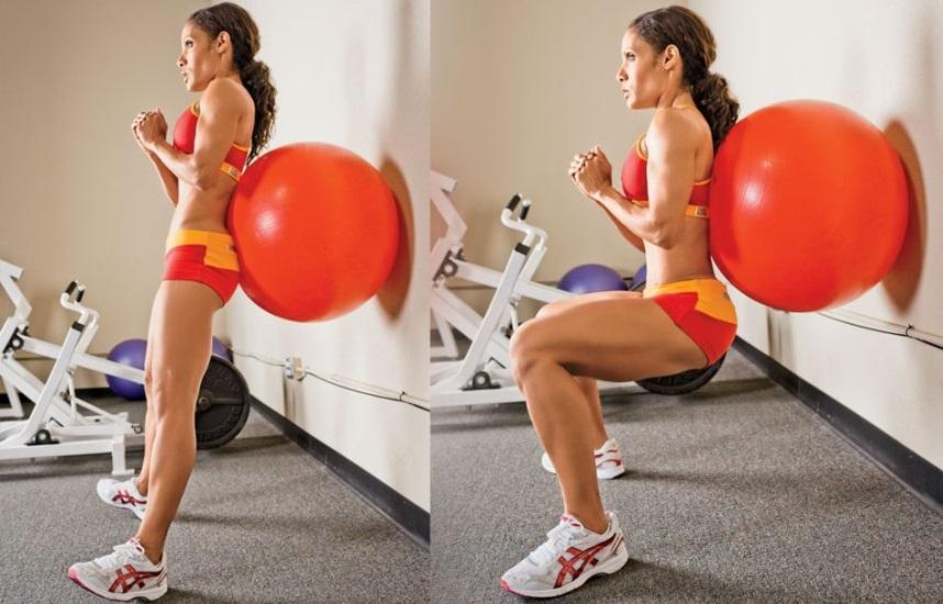 背对墙壁站立,在身体后背与身体之间夹住一个健身球,然后用后背向后靠住健身球顶在前臂上。然后双腿屈膝屈髋下蹲,直到大小腿、大腿与上身都呈90°,就像坐到一把椅子上一样。然后再在双腿的膝盖之间放置一个药球,并用双腿膝盖向内挤压夹住药球不要掉落下去。保持这个姿势60-90秒。