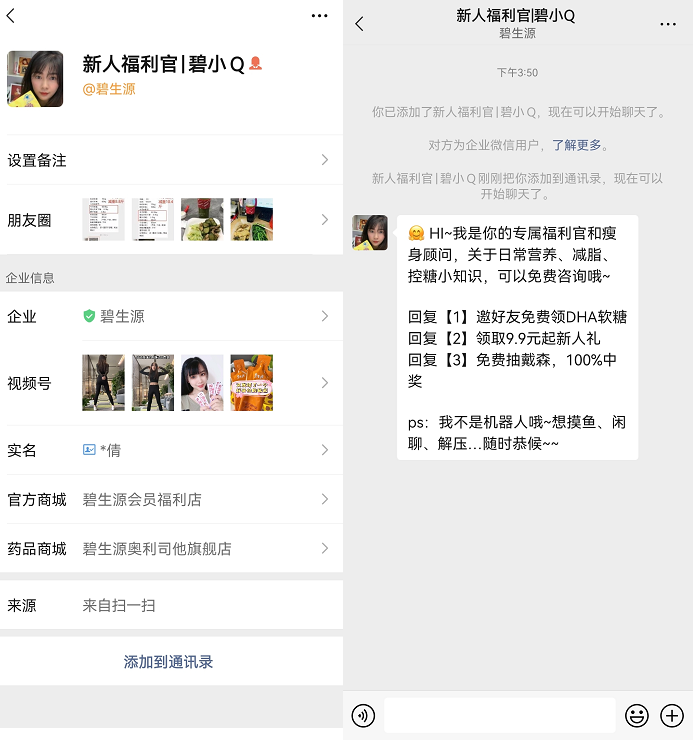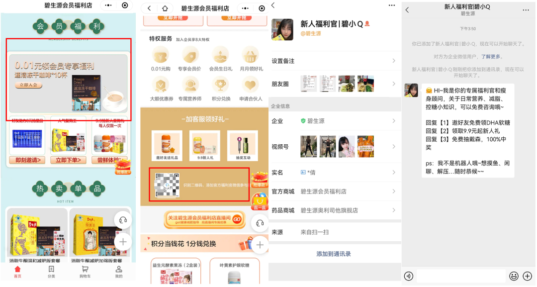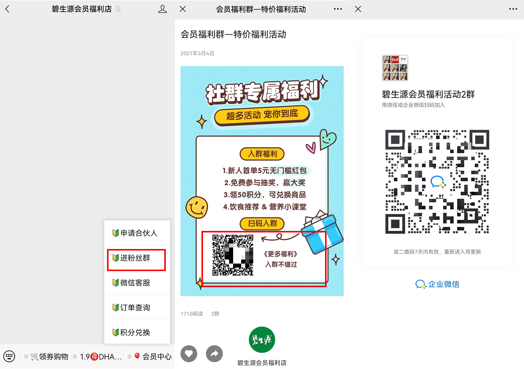 从「碧生源会员福利店」公众号进入,在一级菜单有2个路径可以添加企微,加入社群。