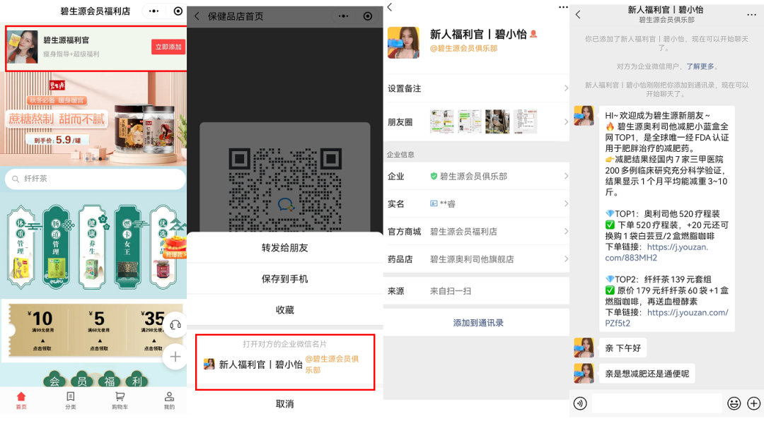 碧生源在小程序的2个不同位置中,分别引导添加不同的福利官企微,介绍不同的产品和服务,以此做用户分层。