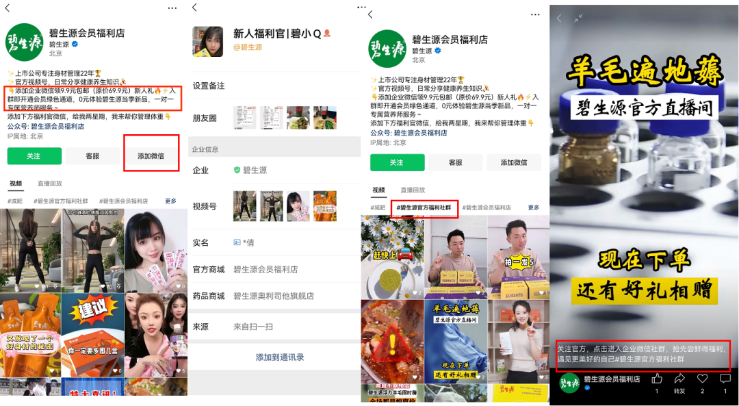 另外,主页展示了“碧生源官方福利社群”的视频话题,部分视频标题有引导用户加入社群。