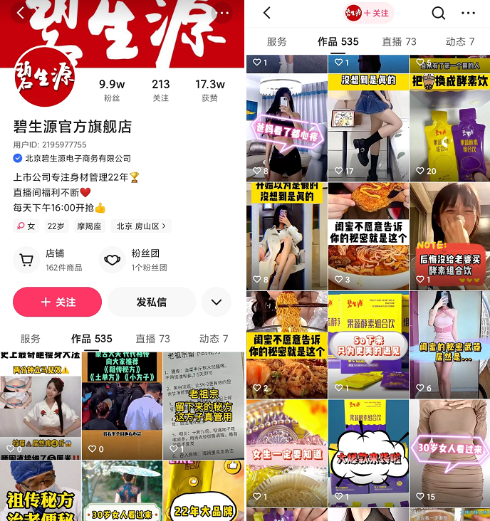 碧生源在抖音上,主要有2个账号,总粉丝超过11万,主要视频内容包括产品种草、直播引流等。