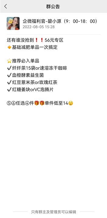 群公告:未定制群规范,主要以产品活动内容为主。