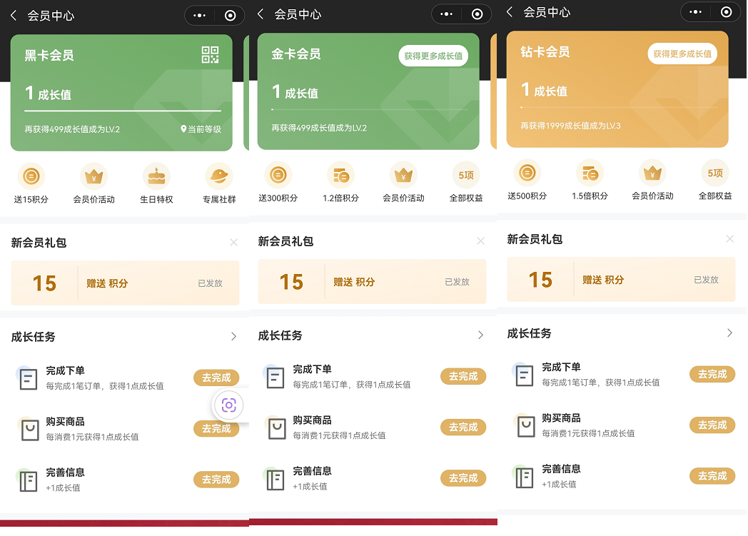 黑卡会员:需填写姓名、出生日和授权手机号即可入会,权益包括入会送15积分、会员价活动、生日特权、专属社群;金卡会员:权益包括升级送300积分、1.2倍积分、会员价活动、生日特权、专属社群;钻卡会员:权益包括升级送500积分、15倍积分、会员价活动、生日特权、专属社群;