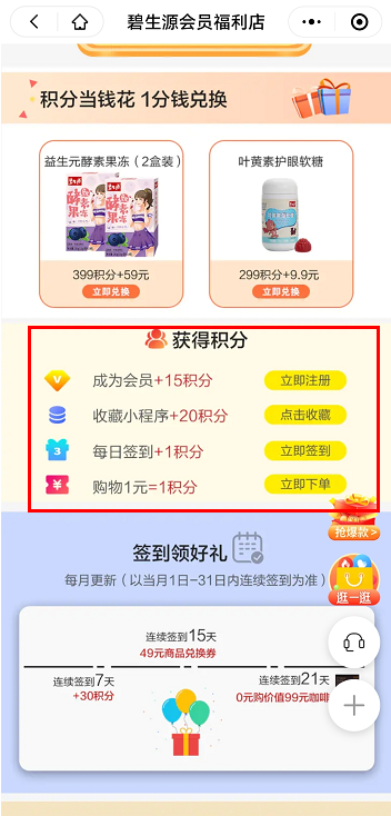 碧生源可通过完成任务、购物,获得积分。使用积分可以兑换优惠券、权益卡和商品。