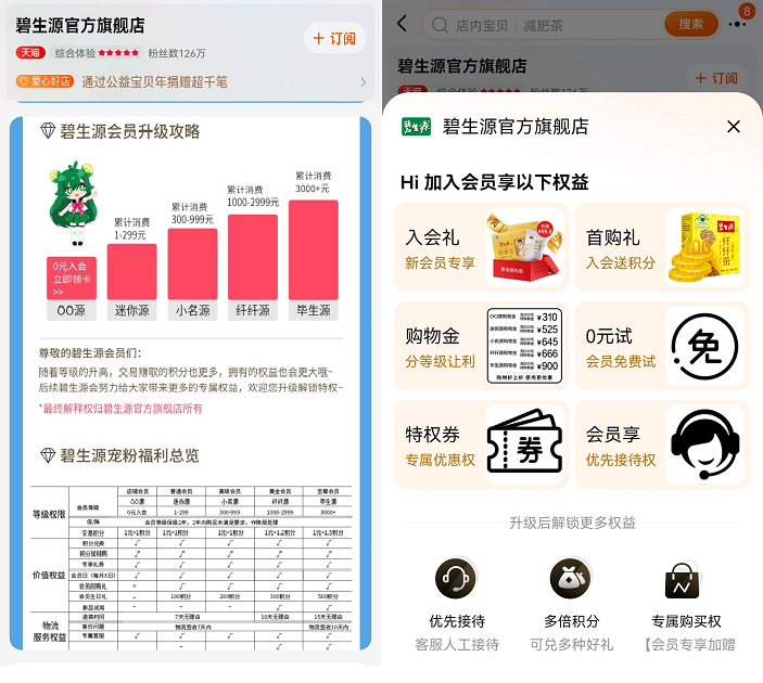 碧生源的天猫店铺会员分为5个等级,等级越高,权益越多。包括:OO源(绑卡入会)、迷你源(消费1笔或消费1元)、小名源(消费满300元)、纤纤源(消费满1000元)、毕生源(消费满3000元)。