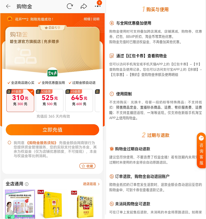 购物金使用时可支持叠加跨店满减、店铺满减、购物券、优惠券、红包、88VIP折扣、淘金币等其他优惠。