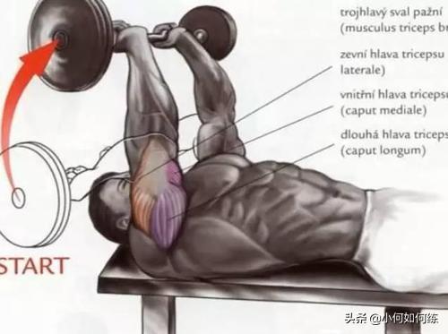 仰卧臂屈伸许多人一开始练的时候找不到肱三头肌的发力感觉,大的原因就是没有控制肘关节的朝向,做仰卧臂屈伸的时候肘部要一直对着双脚的方向,如果肘部向外打开,你的肱三头肌的发力参与度就不高了。9