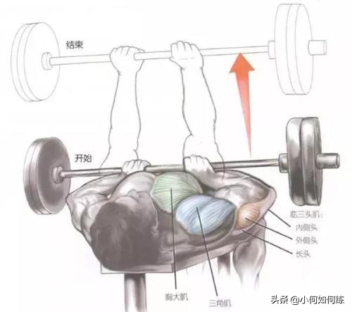 仰卧于杠铃凳上,双手采用正手姿势握住杠铃杆,卧距要窄于肩宽,在15里面左右为佳;出杆后将杠铃杆置于胸口乳头正上方,逐渐降低杠铃高度直至轻触胸部为止;垂直推起杠铃,直到手臂伸直,肘关节闭合。