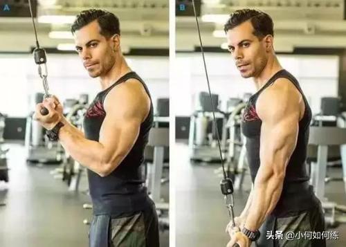 龙门架绳索下拉针对的是我们肱三头肌的内侧头,也就是所谓的马蹄印的关键。做龙门架绳索下拉的时候一定要将双手拉至身体的两侧,肘关节有一个轻微的外旋动作,对于马蹄印的肌峰处刺激感觉会更好。
