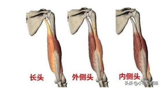 我们先来看看肱三头肌的肌肉构成肱三头肌位于我们的大臂后侧,覆盖于肱骨,有三个头,分别是外侧头、长头和内侧头,故名肱三头肌。