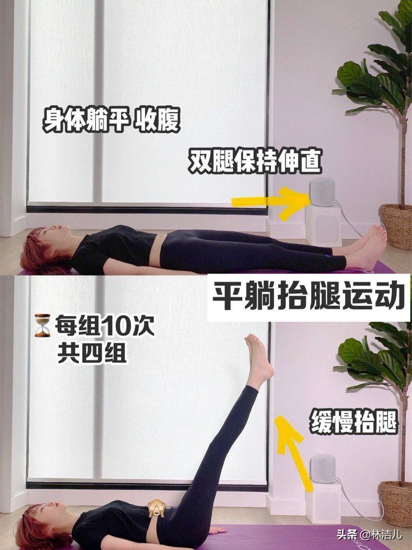 4、平躺抬腿运动身体平躺收腹、双腿维持伸直的状态,缓慢地同时抬起双腿,每次抬腿时核心要放在腹部,再缓缓放下,重复10次抬腿为一组,一共做4组。