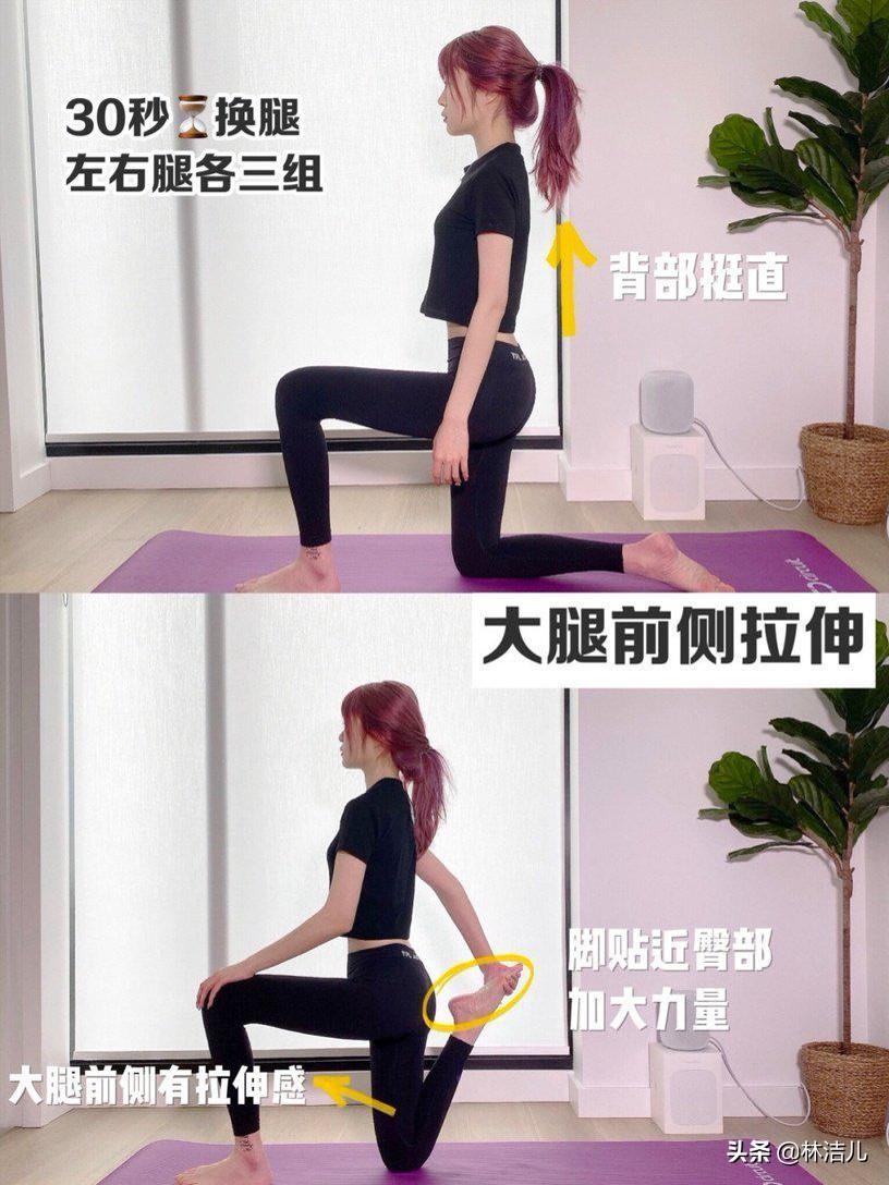 1、大腿前侧拉伸第一个动作主要是大腿前侧拉伸,先将背部挺直来到半跪姿,接着勾起右后脚并用手拉近自己臀部,这个时候如果感觉到大腿前侧有拉伸的感觉就对了,维持30秒拉伸即可换边,左右腿各3组。