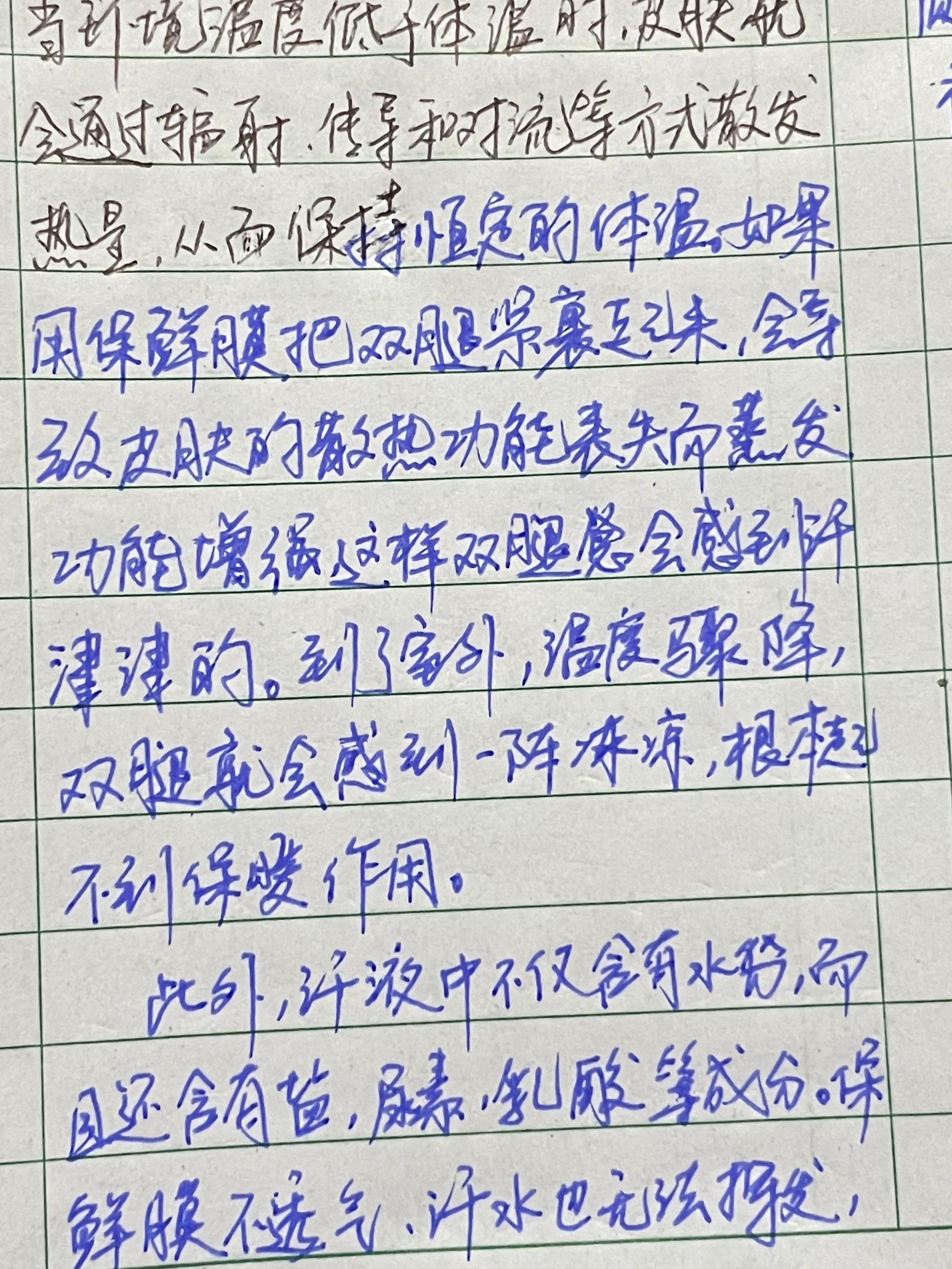 人的皮肤具有调节体温的作用,当环境温度低于体温时,皮肤就会用过辐射、传导和对流等方式散发热量,从而保持恒定的体温,如果用保鲜膜把双腿紧裹起来,会导致皮肤的散热功能丧失而蒸发功能增强,这样双腿总会感到汗津津的。到了室外,温度骤降,双腿就会感到一阵冰凉,根本起不到保暖作用。