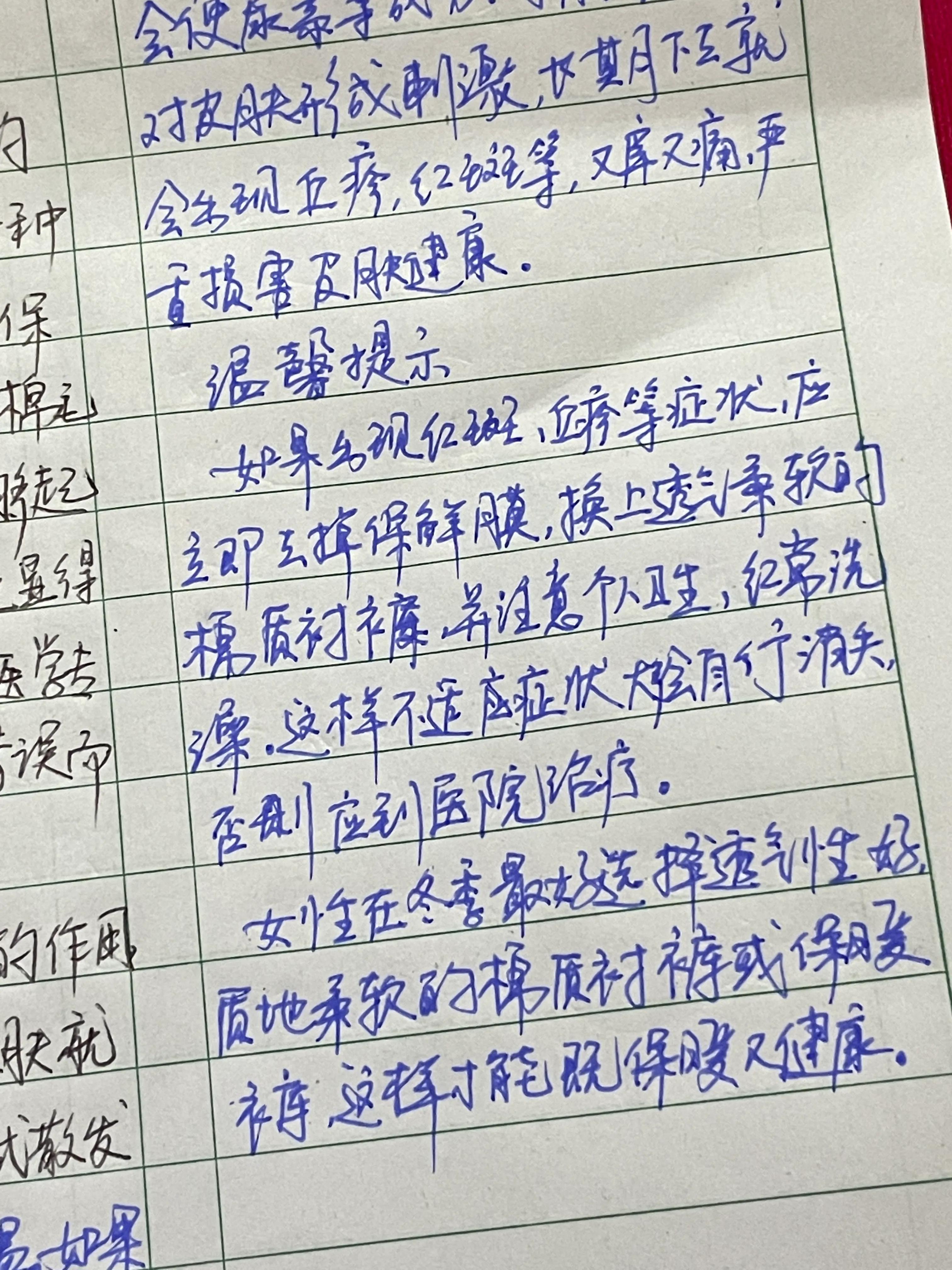 如果出现红斑,丘疹等症状,应立即去掉保鲜膜,换上透气柔软的棉质衬裤,并注意个人卫生,经常洗澡,这样不适症状大多会自行消失,否则应到医院调节。