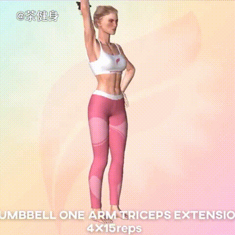 双腿与肩同宽站立,单手抓握一只哑铃,举过头顶,然后做小臂伸的动作。