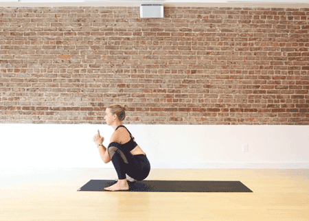 呼气,屈膝下蹲,臀部找地面